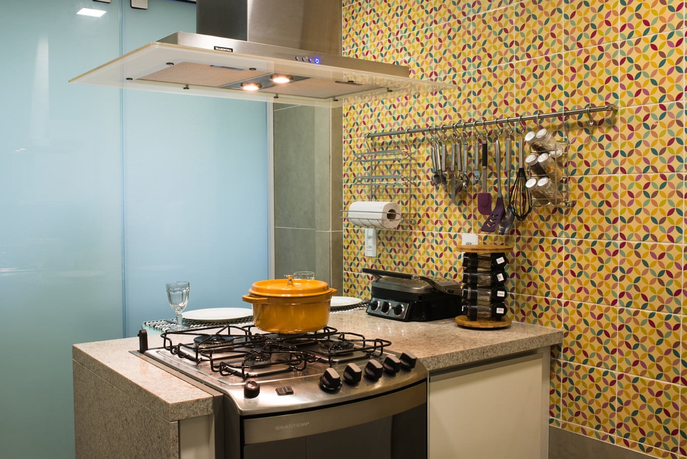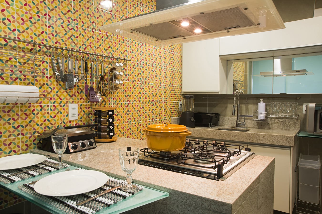 Com um toque futurista e moderno, um mosaico composto por cores vibrantes e desenhos geométricos promove dinamismo ao ambiente. “As casas costumam ter muitas paredes brancas e brincar com texturas e cores, através de mosaicos e papel de parede, dá um novo estilo ao lugar, principalmente com modelos que trazem formas geométricas e brilho”, pontua o arquiteto.