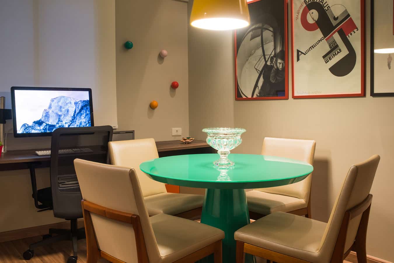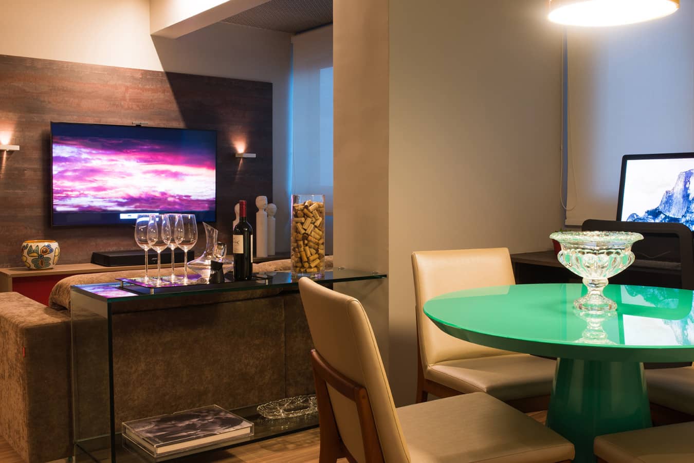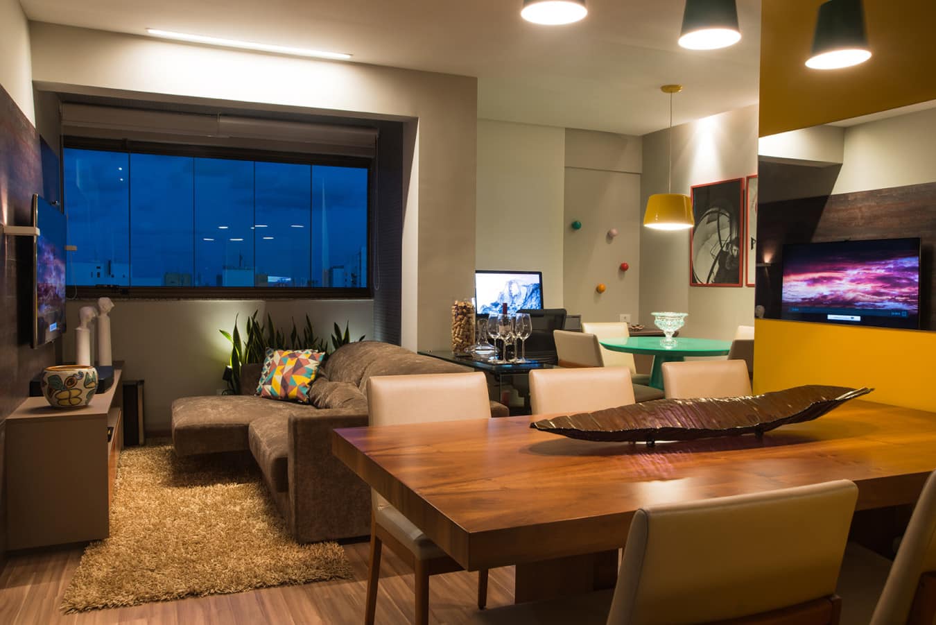Logo na entrada da casa, uma parede amarela dá o tom a sala de jantar. Com mesa e cadeiras com nuances de madeira, o espaço é combinado a luminárias verdes assinadas pela Da Luz e a tela do artista plástico Carlos Pragana, peça que propõe ainda mais cor ao ambiente. “Eles são bastante cosmopolitas e trabalham viajando, por isso possuem diversas influências. No projeto, não há uma predominância de cor, mas relações entre tonalidades marcantes que aparecem em paredes e objetos. O todo gera um espaço harmônico e um diálogo fluído”, destaca Rafael.