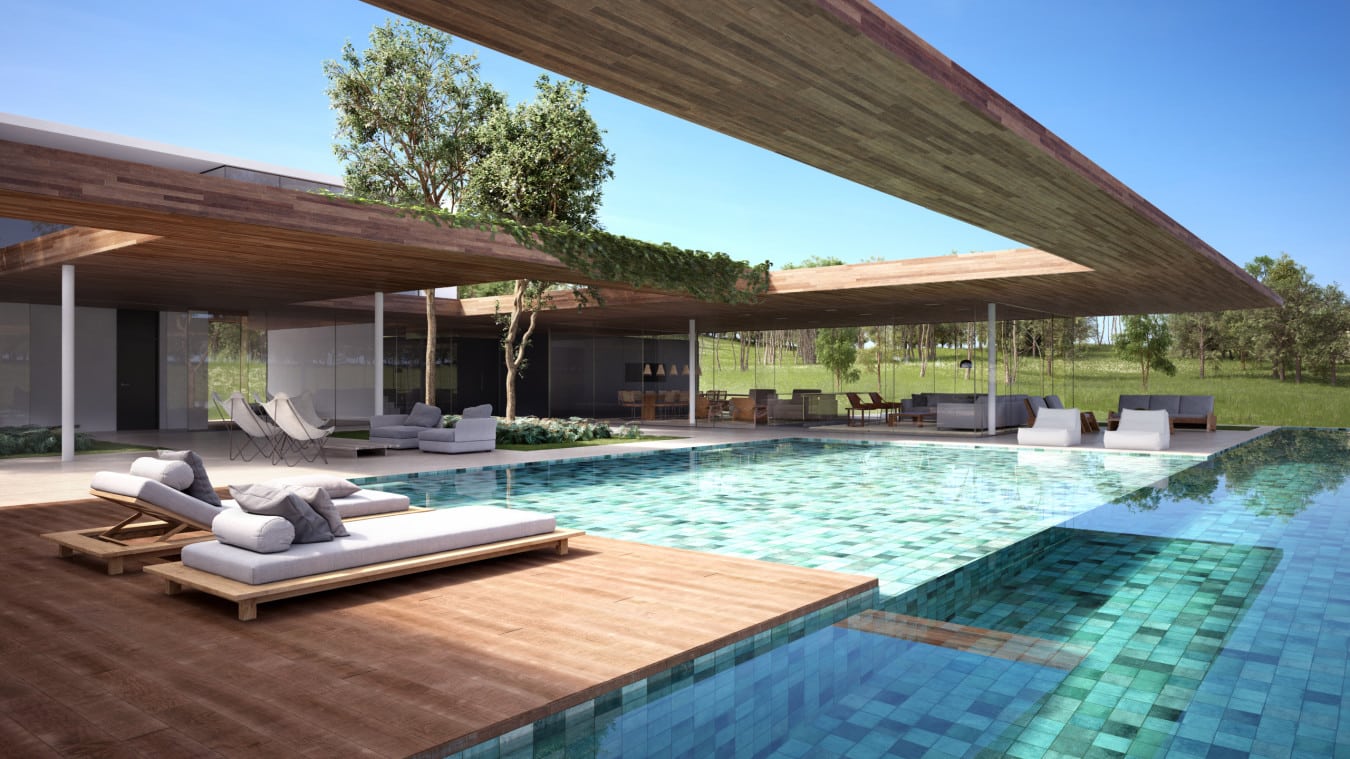 Uma das residências assinadas é quase toda térrea, organizada em torno de um pátio semicoberto que se funde com a paisagem. A ideia, segundo Lourenço Gimenes, foi criar um grande plano vazado que desafia a compreensão da varanda clássica e reforça a horizontalidade do conjunto. O terreno é de 3450 m², sendo cerca de mil metros de área interna e coberta.