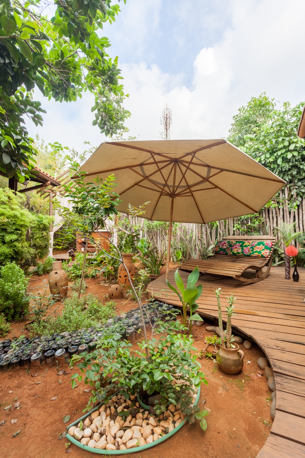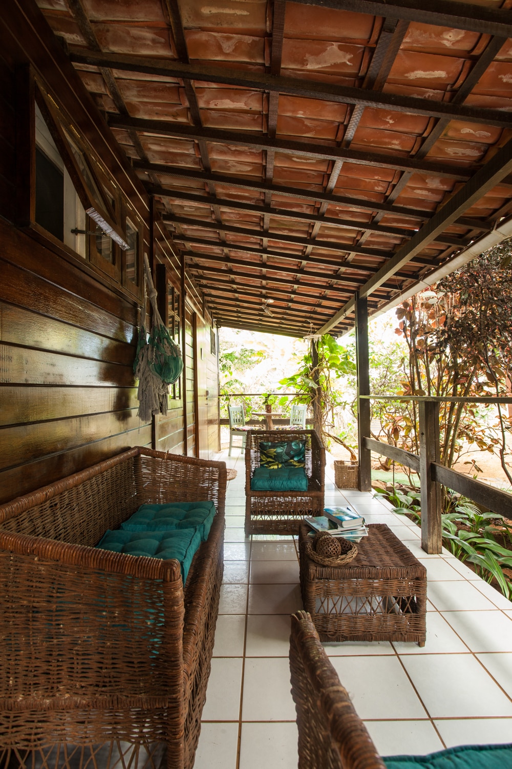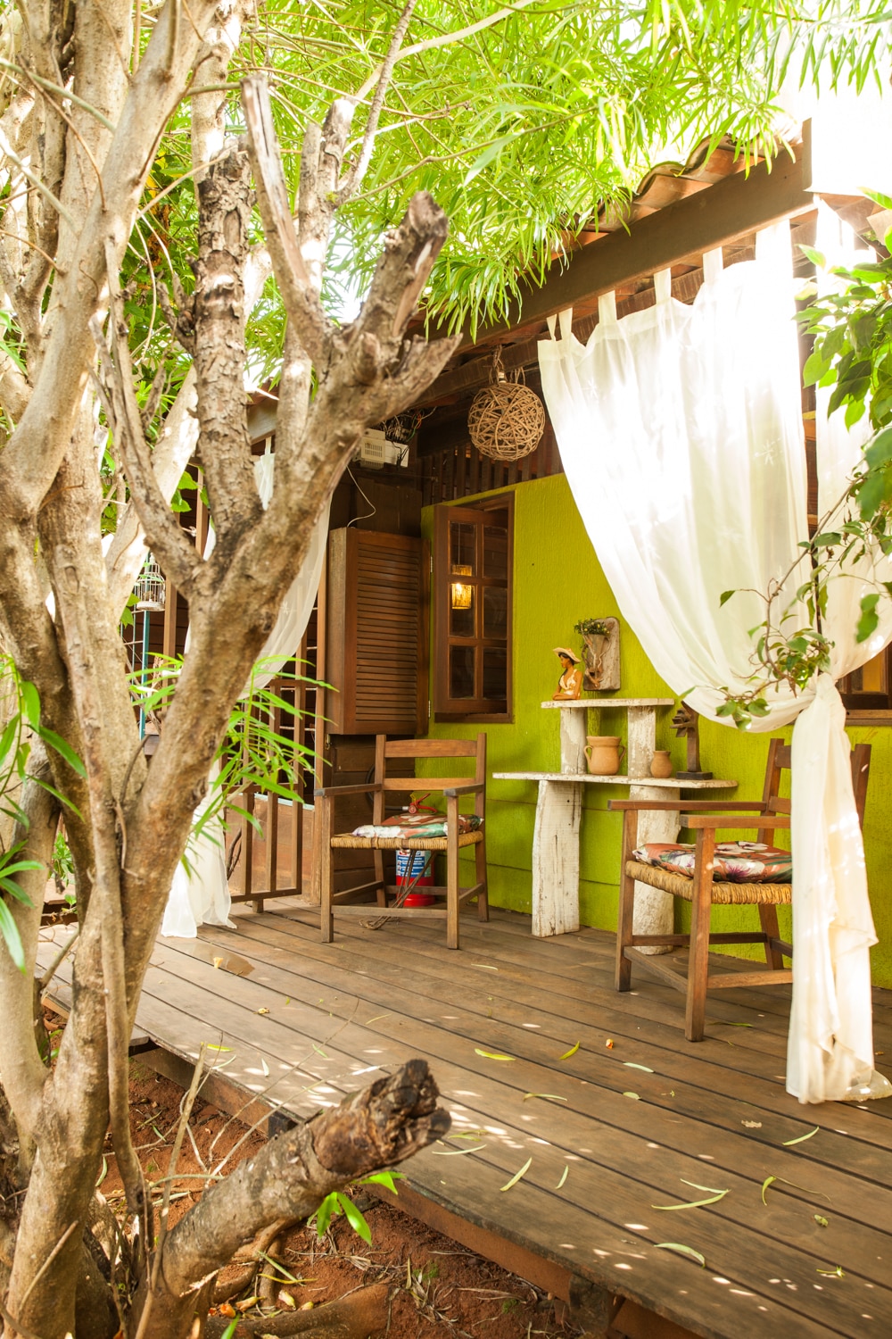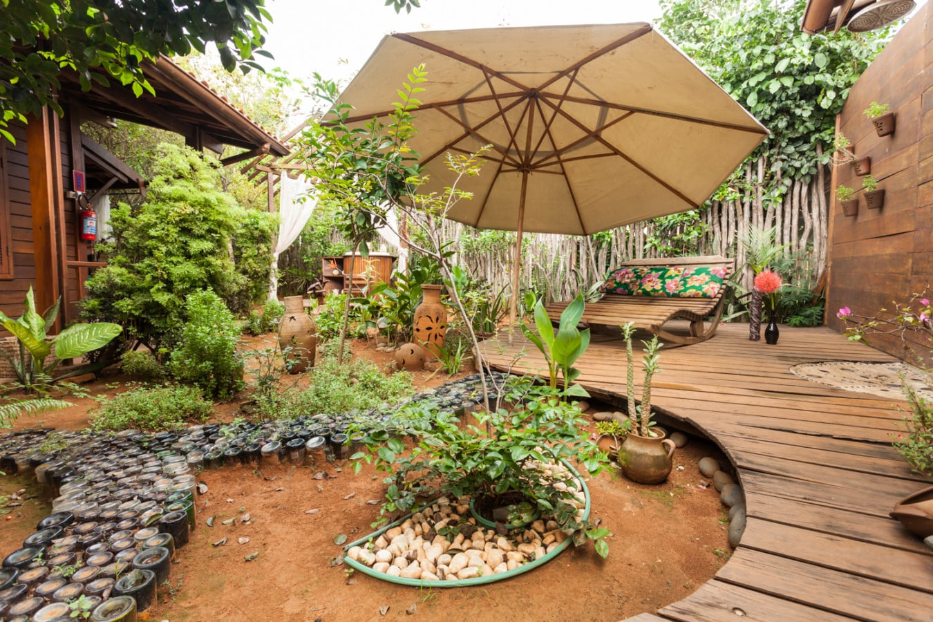 Além da madeira, outros materiais de reuso foram utilizados na pousada. “Sempre gostei muito de decoração, e fiz questão de criar todo o artesanato, como as luminárias da entrada, feitas com isoladores de alta tensão, que estavam em desuso, a passarela de garrafas de vidro e os móveis da pousada, em sua grande maioria, são de madeira de demolição. Na ilha não cabe o luxo exacerbado, temos que prezar pelo clima mais rústico, cara de litoral”, defende a proprietária Silvana Rondelli, que priorizou, dentre os materiais utilizados, o uso do artesanato, da palha e da madeira.