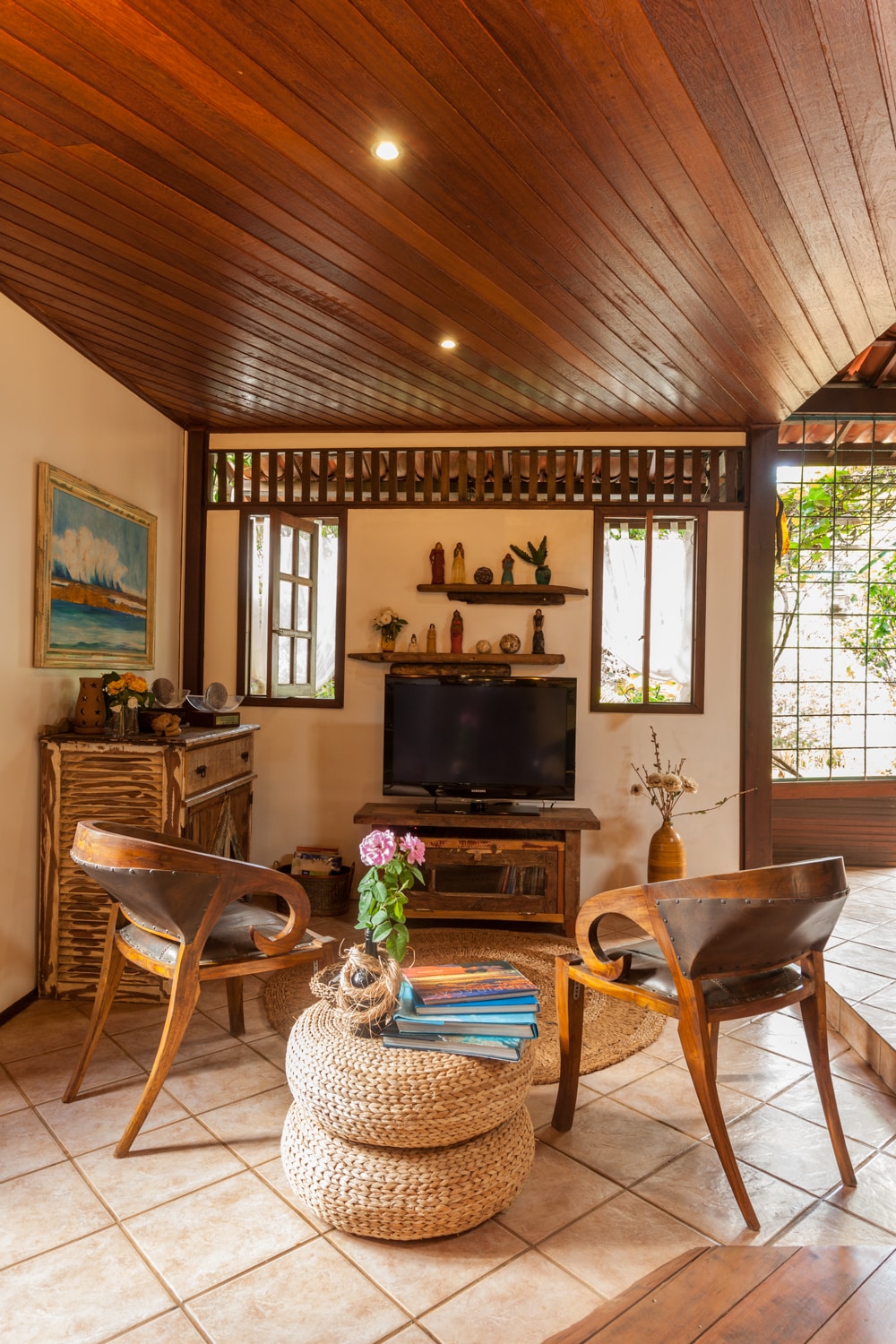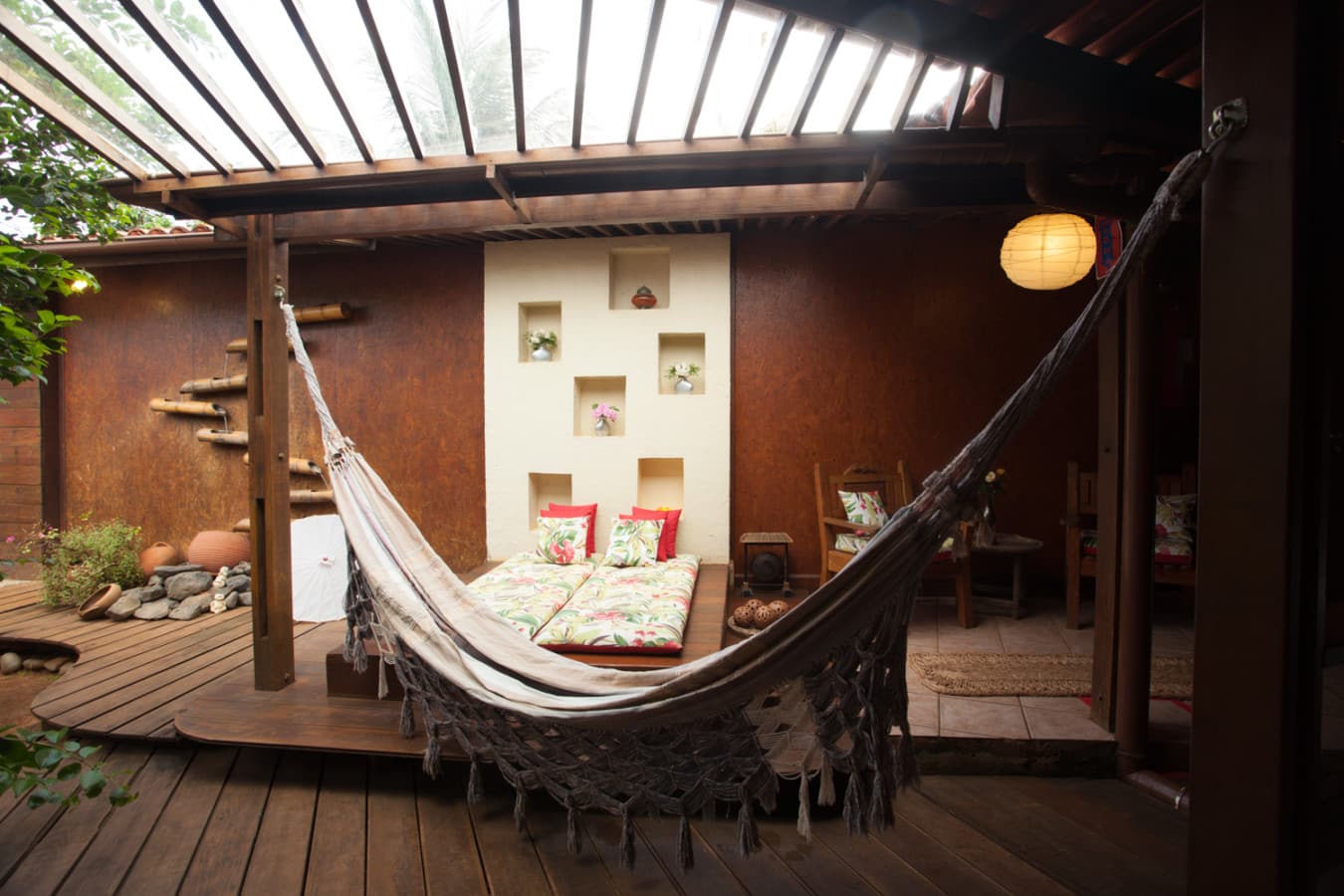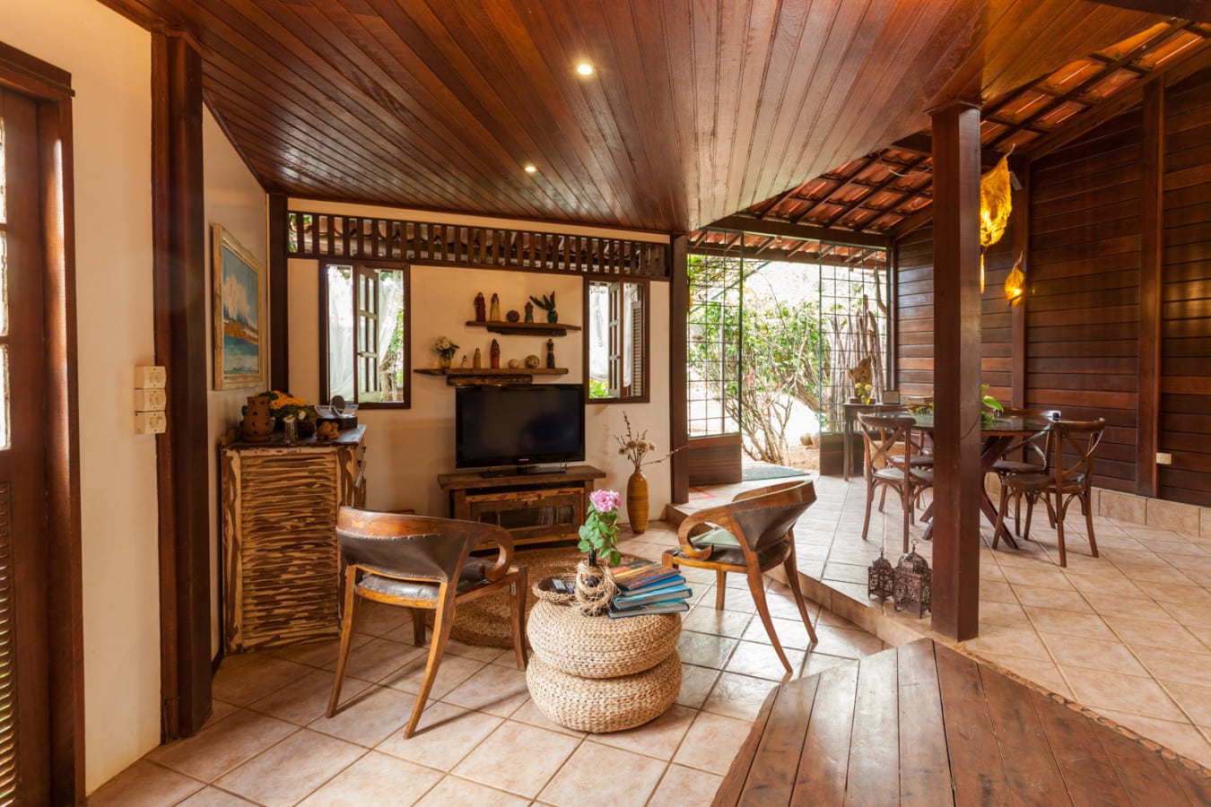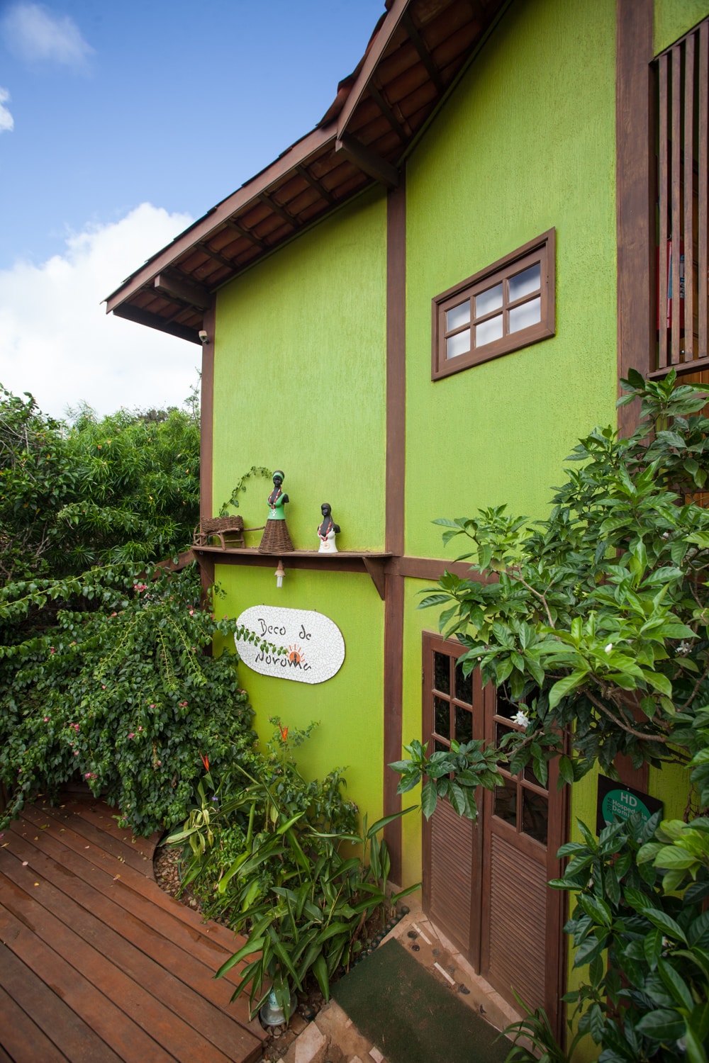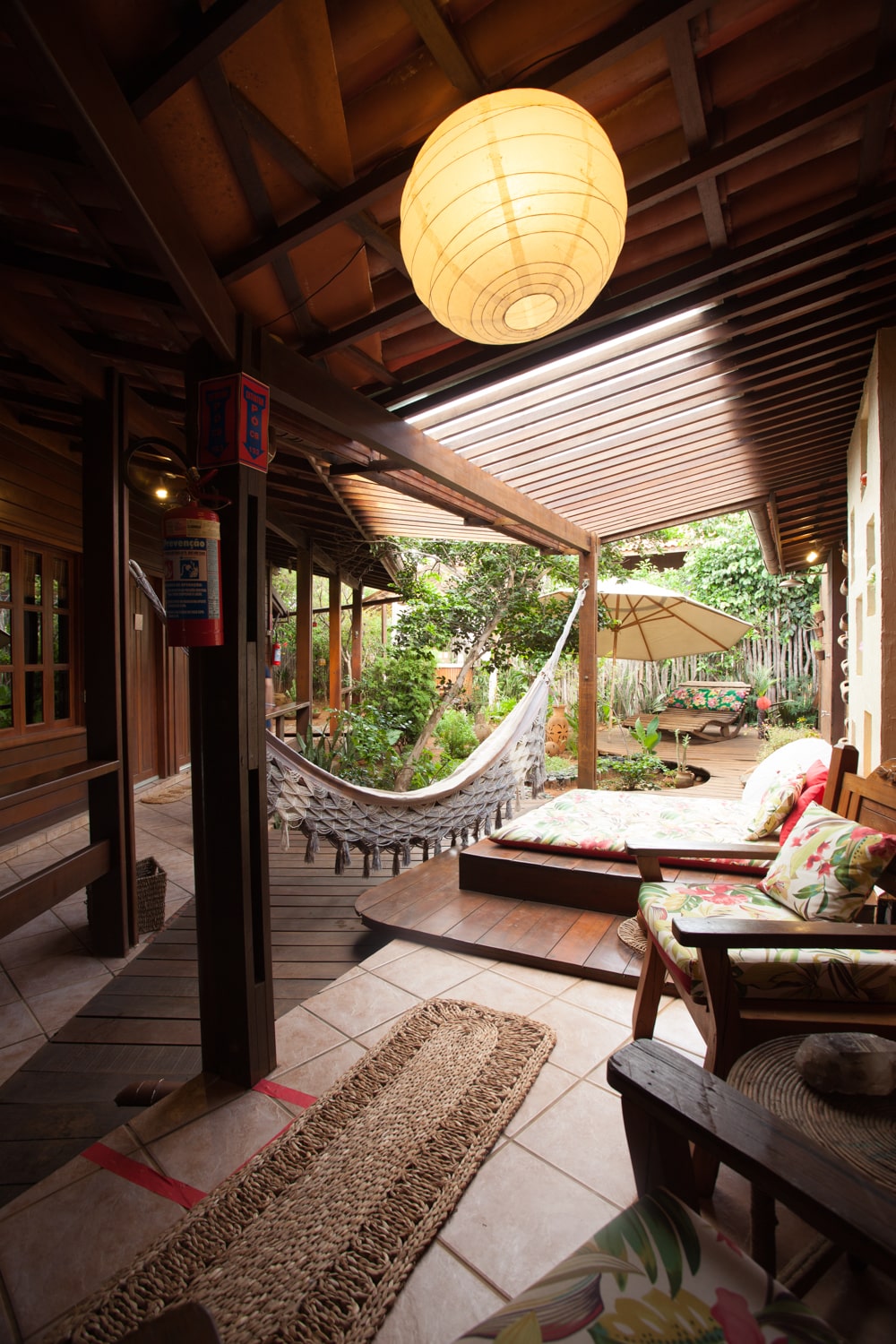 Além da madeira, outros materiais de reuso foram utilizados na pousada. “Sempre gostei muito de decoração, e fiz questão de criar todo o artesanato, como as luminárias da entrada, feitas com isoladores de alta tensão, que estavam em desuso, a passarela de garrafas de vidro e os móveis da pousada, em sua grande maioria, são de madeira de demolição. Na ilha não cabe o luxo exacerbado, temos que prezar pelo clima mais rústico, cara de litoral”, defende a proprietária Silvana Rondelli, que priorizou, dentre os materiais utilizados, o uso do artesanato, da palha e da madeira.