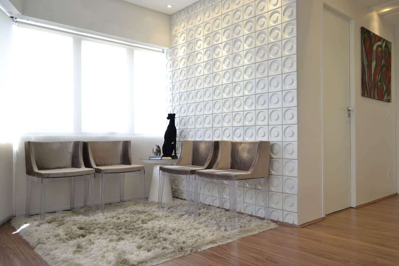 "Antes de chegar à secretária, nossos clientes são recebidos por obras de arte contemporâneas. Transformamos o corredor em uma galeria de arte constantemente atualizada. Nas fotos estão as obras de Júlia Costa mas já utilizamos outros artistas, como André Nóbrega. Isso agrega muito valor ao escritório e faz o cliente se sentir bem recebido", explica Marylia.