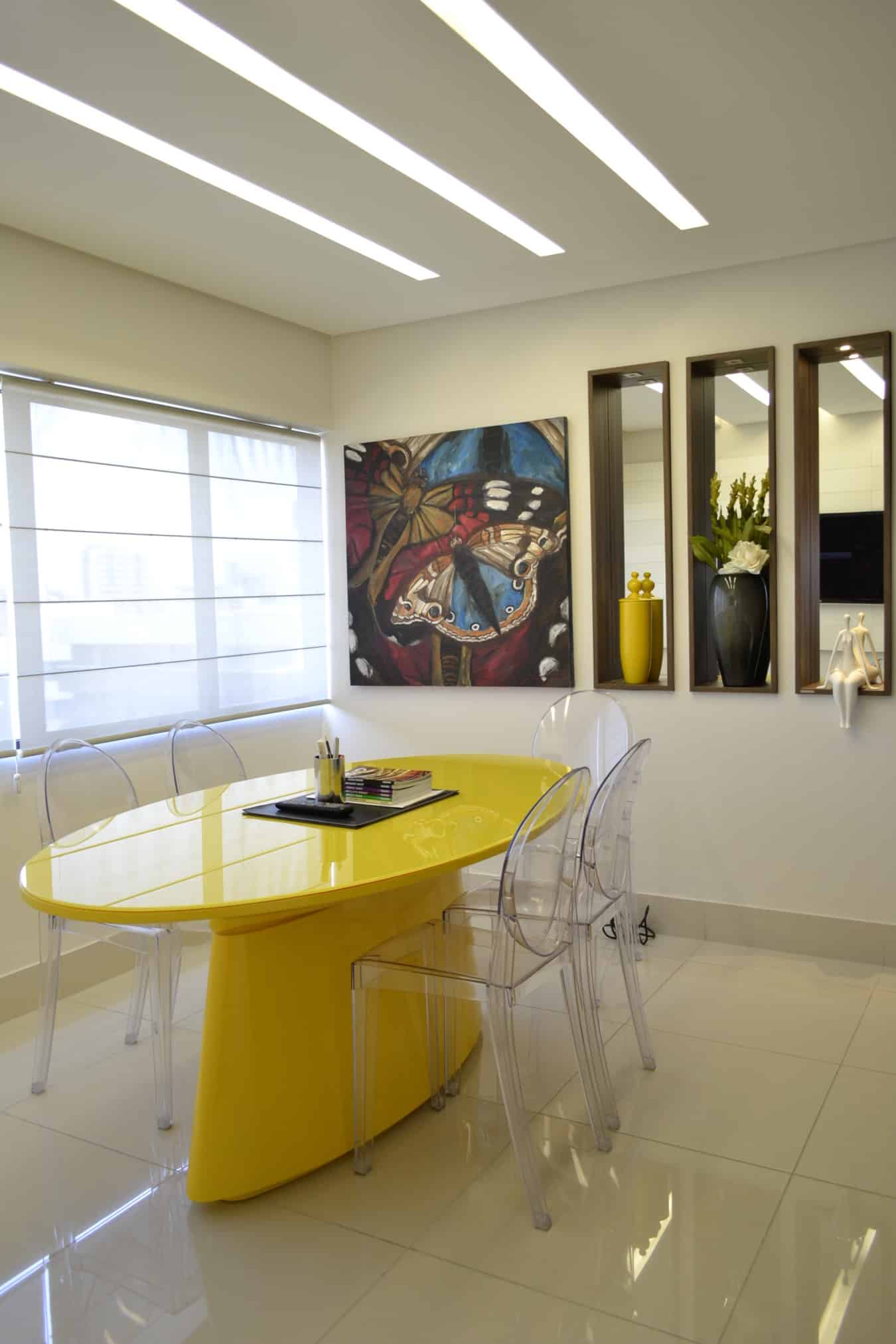 A decoração da sala de espera brinca com os elementos e texturas, onde a arquiteta optou por utilizar piso laminado, cadeiras e luminárias de design e revestimento cimentício, trazendo charme e personalidade ao projeto. Na sala de reunião, integrada com a da arquiteta, o grande destaque fica por conta da mesa amarela. "Procurei usar meu próprio escritório para ousar, promovendo no cliente uma experiência com cores e texturas, através de móveis de design", argumenta Marylia, que optou por revestimento em laca brilho para o painel e cadeiras transparentes para o espaço. Para resolver um problema com uma pilar estrutural, a arquiteta projetou nichos decorativos, revestidos com espelhos e iluminação indireta. Já o lavabo tem uma proposta mais clean, com revestimento em papel de parede em tons claros e cuba de vidro.