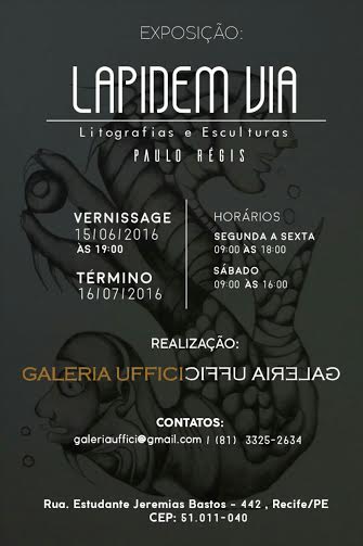 “Lapidem Via”, significa, o caminho das pedras. A exposição homônima, do artista plástico Paulo Régis, apresenta a expressão da arte com o encontro das pedras que estão em seu caminho. Pedras essas que deram origem às litogravuras e rochas calcárias que resultaram em esculturas. A partir da próxima quarta-feira (15), essas duas técnicas estarão em destaque, na Galeria Uffici, onde Régis expõe inéditas 26 litogravuras e 6 esculturas.