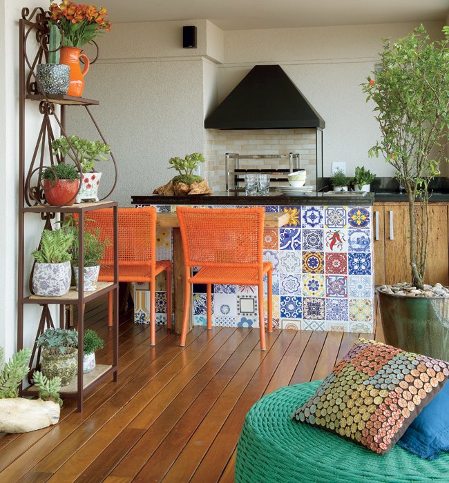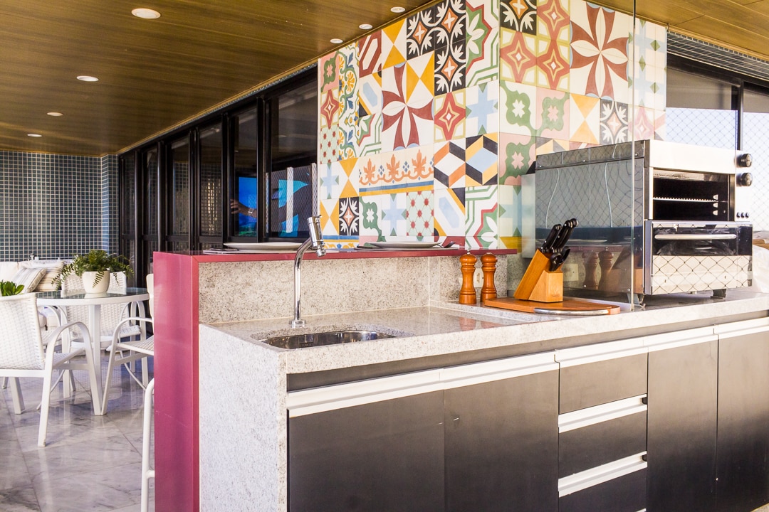 Por ser um ambiente descontraído e informal, na decoração, o ideal é apostar em elementos mais rústicos, com cimento queimado, bancadas em mármore ou pedras tecnológicas, que têm maior resistência a altas temperaturas. “Para destacar a varanda da área externa, o ideal é investir em pisos diferentes. Há opções vinílicas ou de madeira natural, que é a que nós mais indicamos”, revela Luis Dubeux, da Dubeux+Vasconcelos Arquitetura. “Nas paredes, também é interessante usar revestimentos, como o ladrilho hidráulico, por exemplo”.
