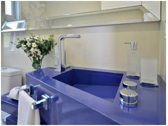 - À esquerda, projeto: Tania Bertolucci de Souza usou o azul jeans na bancada, complementando a produção com misturador Blend Flex da Docol. À direita, imagem divulgação: Chuveiro Lumina Blue da Docol é opção para composições em azul nos banheiros (Foto: Divulgação)