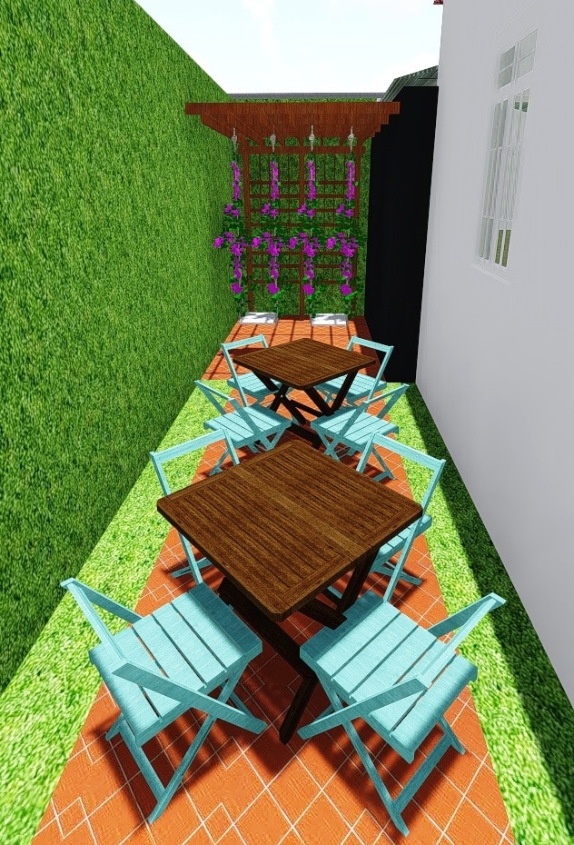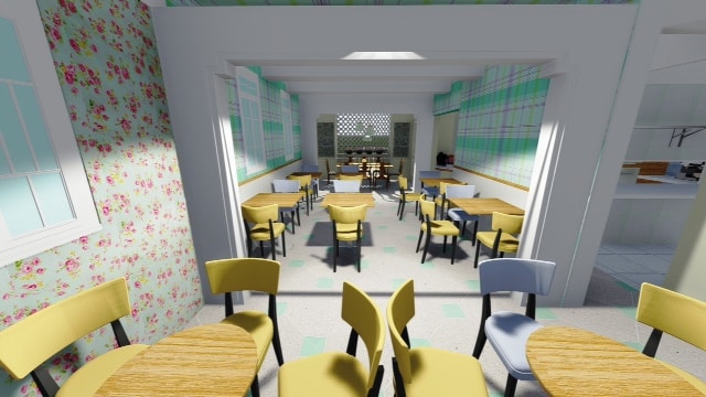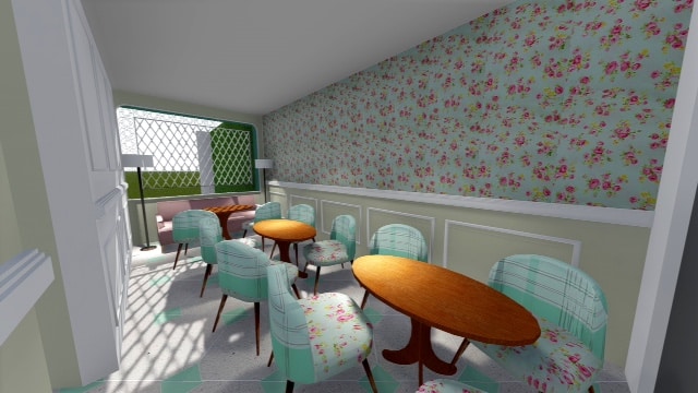 O projeto dispõe ainda de um terraço com cadeiras de ferro e revestimento em azulejo. Dois novos espaços compostos de um salão de chá, onde serão colocados poltronas revestidas com tecido bordado dando um ar romântico e adamascado ao ambiente serão distribuídas em três mesas de chá, além de um cantinho externo com balanços em madeira para as crianças também são previstos para o local. "O salão comum acolhe mais ou menos 16 clientes", pontua a arquiteta Isis Almeida, que está no comando das obras. Como a nova unidade será o ponto de produção das duas lojas, o projeto abraça também uma cozinha de 120m².