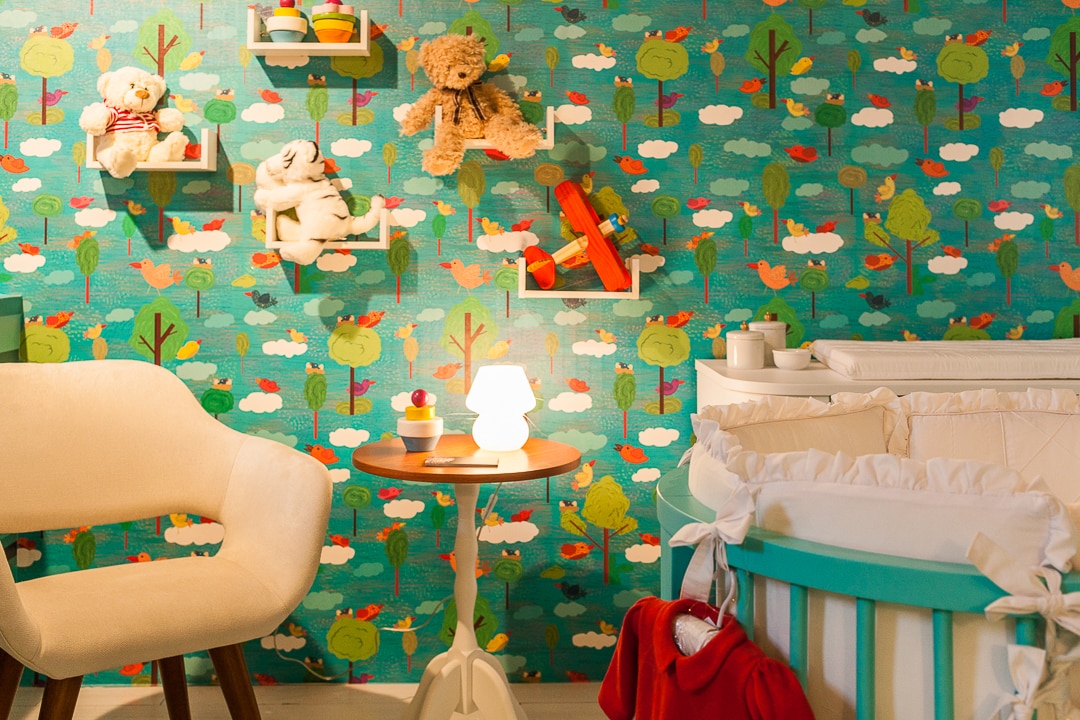 poltrona de apoio têm cores vibrantes para estimular as crianças e trazer um ar descontraído. A iluminação é indireta, através de uma composição na parede, além do abajur criando outro ponto de luz. O piso é vinílico, mais resistente, com a vantagem de não machucar a criança quando ela andar