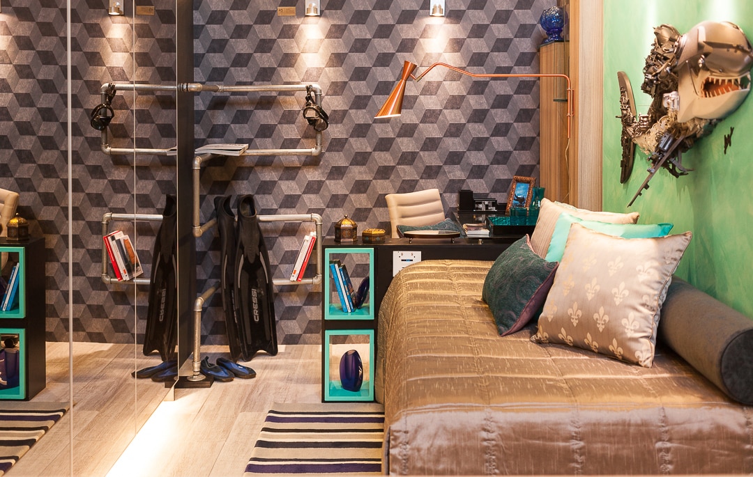 Já no espaço Quarto do Jovem Solteiro, a arquiteta Thereza Aca lutou contra o desafio de projetar um dormitório compacto sem deixar a funcionalidade de lado, realidade vista hoje no mercado imobiliário nacional. A solução foi investir em elementos Apaixonado por aventuras, o cliente é mergulhador e, para dar personalidade ao ambiente, uma escultura de tubarão feita com resíduos sólidos do artista pernambucano J. Azevedo.